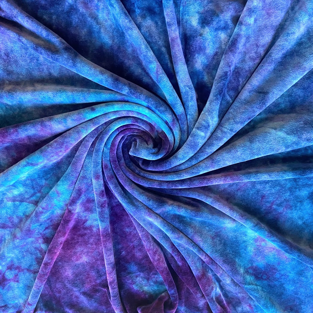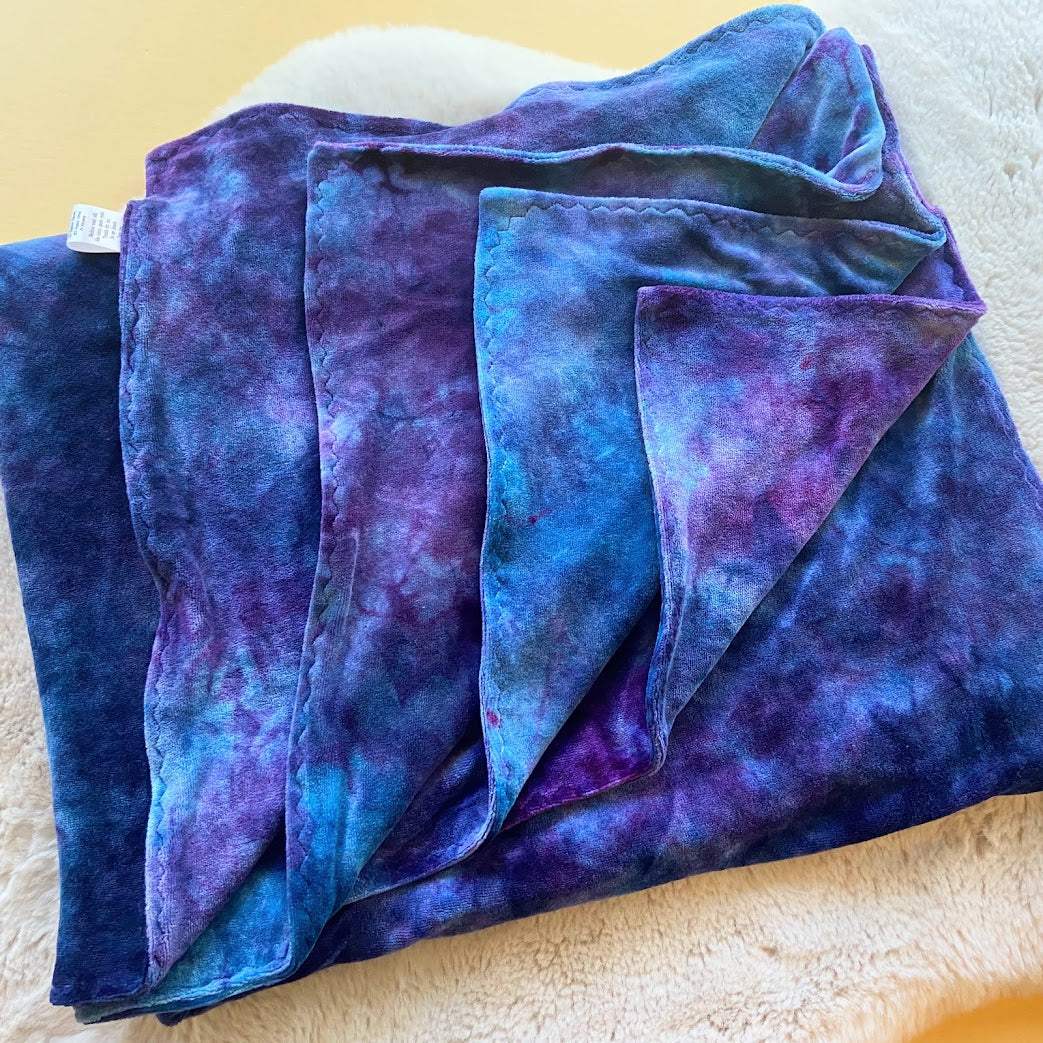 Entire blanket handmade in bamboo velour (70% viscose bamboo, 28% organic cotton, 2% polyester). It has been hand dyed LWI (low water immersion) style. This style of dyeing results in beautiful, random color patterns as the dyes mix and mingle into new colors, making each piece beautifully unique.