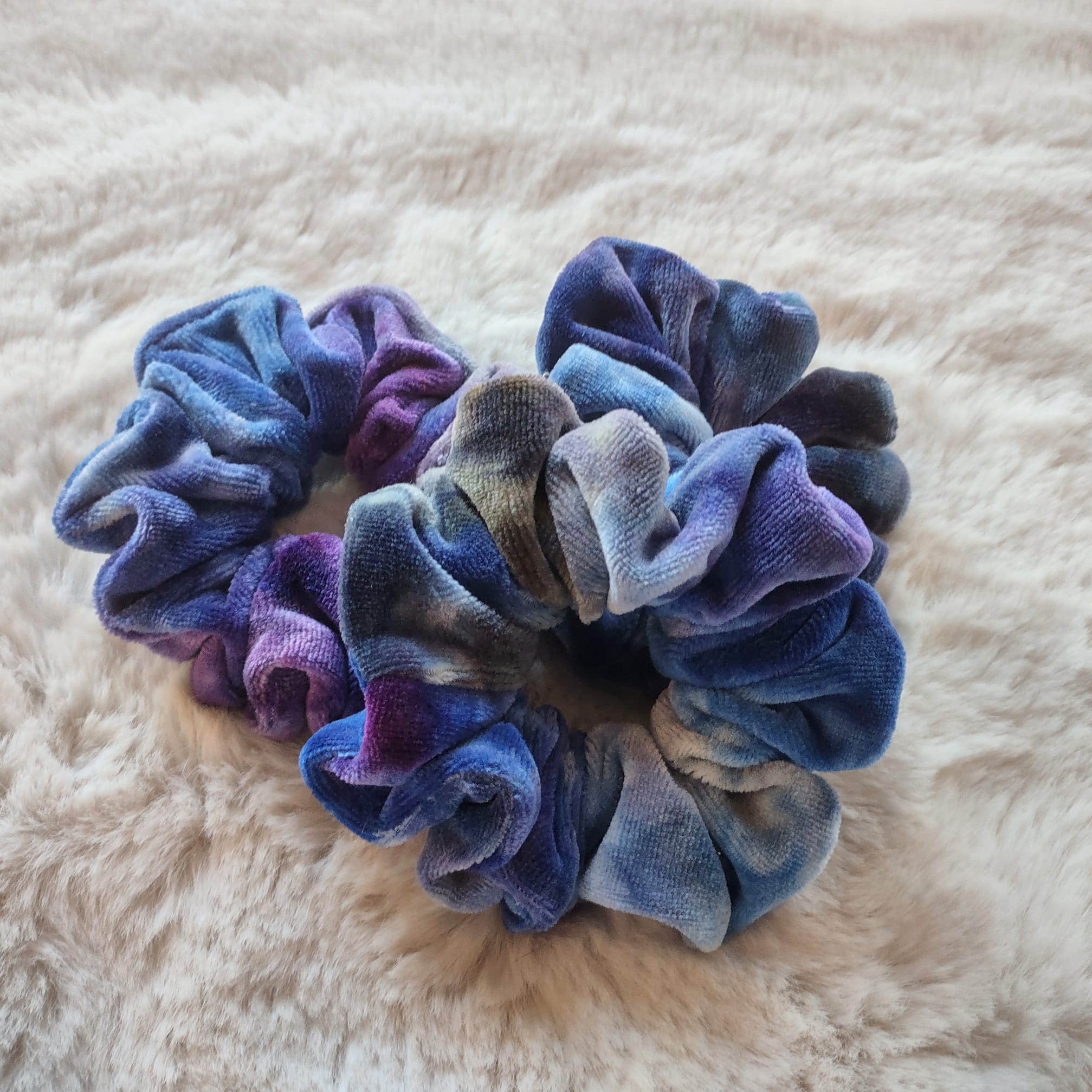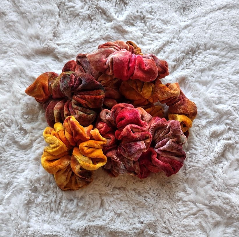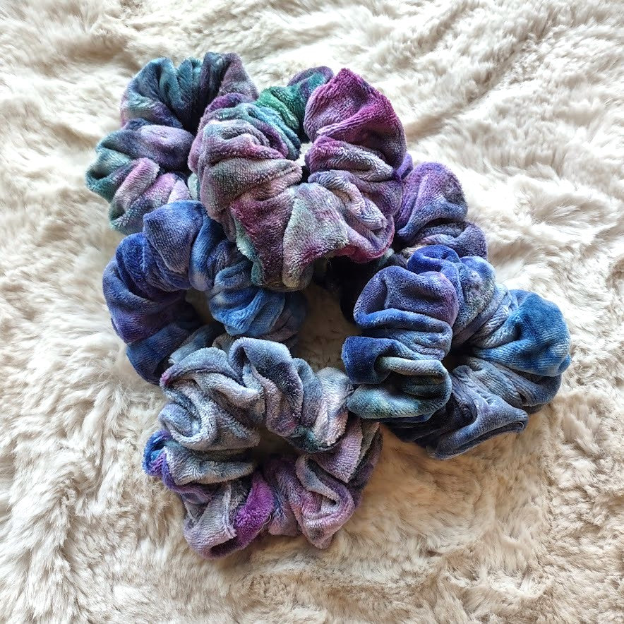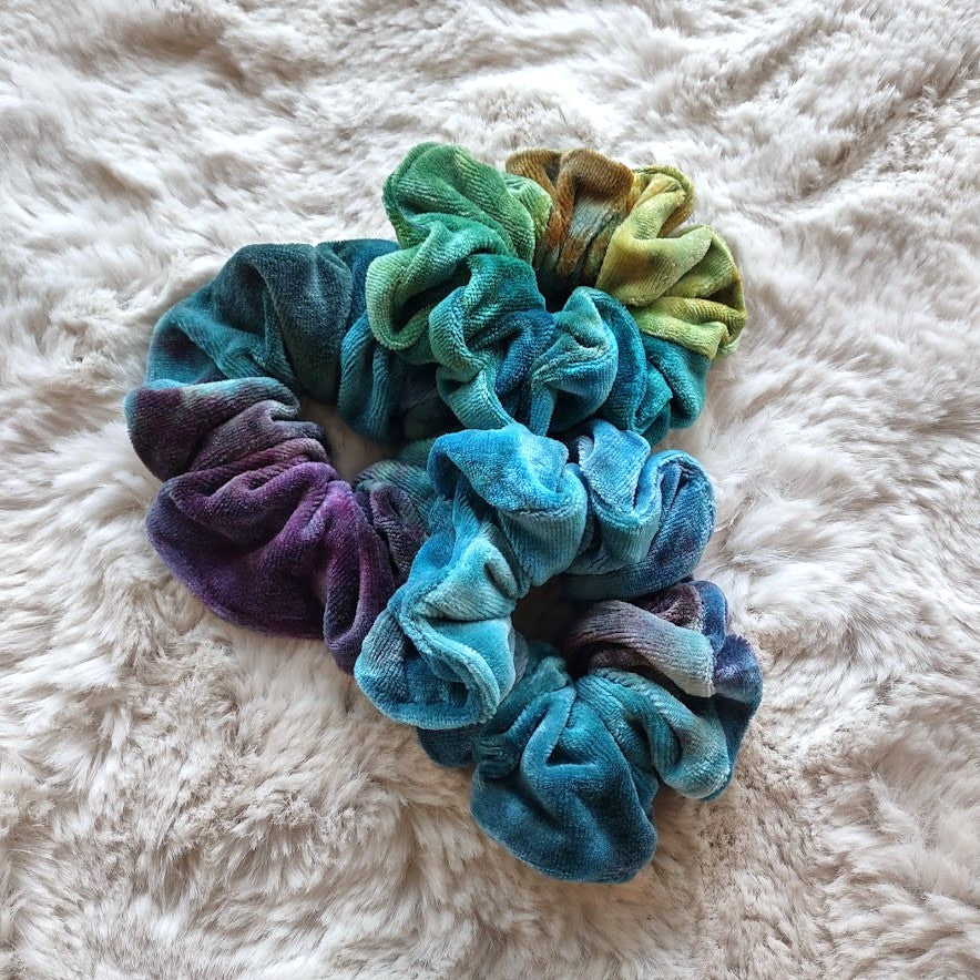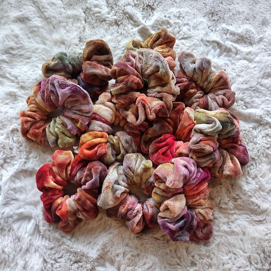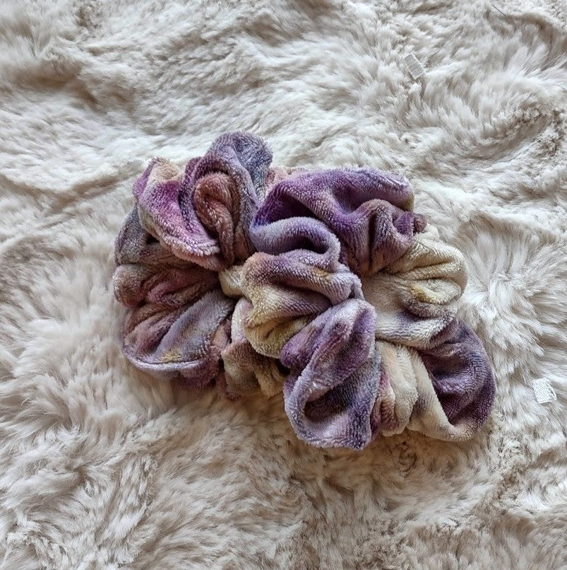 Luxury oversized scrunchies hand made in bamboo velour (70% viscose bamboo, 28% organic cotton, 2% polyester). They have been hand dyed LWI (low water immersion) style with procion dyes. This style of dyeing results in beautiful, random color patterns as the dyes mix and mingle into new colors, making each piece beautifully unique.